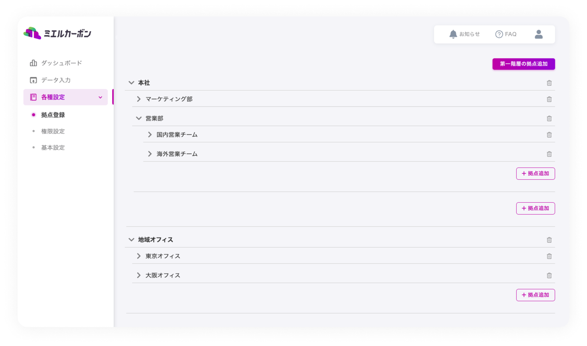 自社の算定対象拠点をツールに登録します。拠点は5階層に分けて登録することができます。