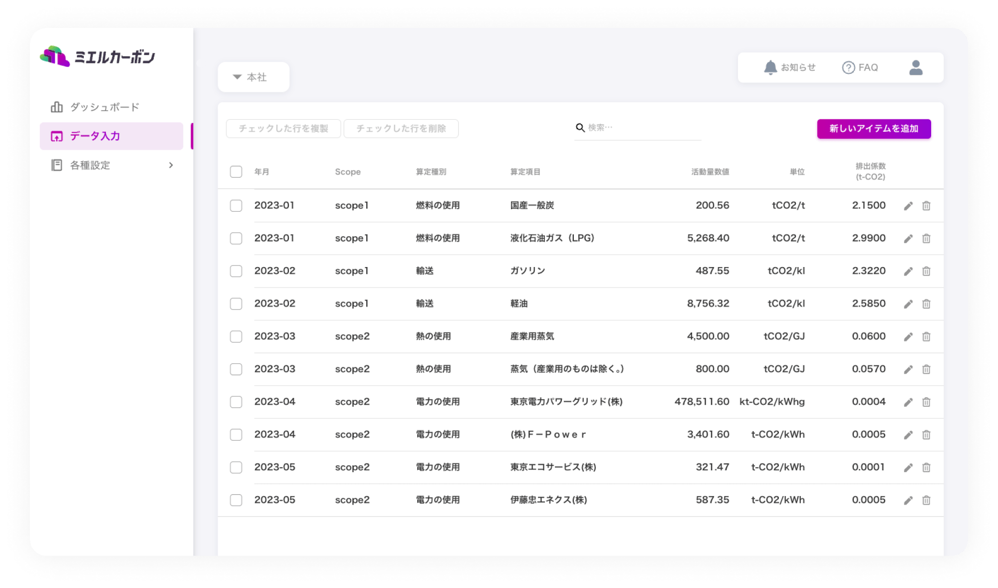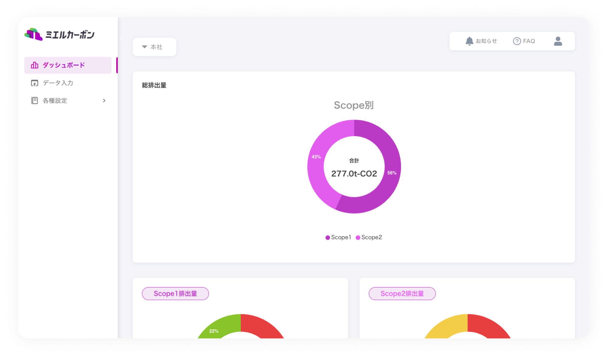 データを入力するだけで自動的に排出量が算定されます。 排出量はダッシュボードで確認できます。